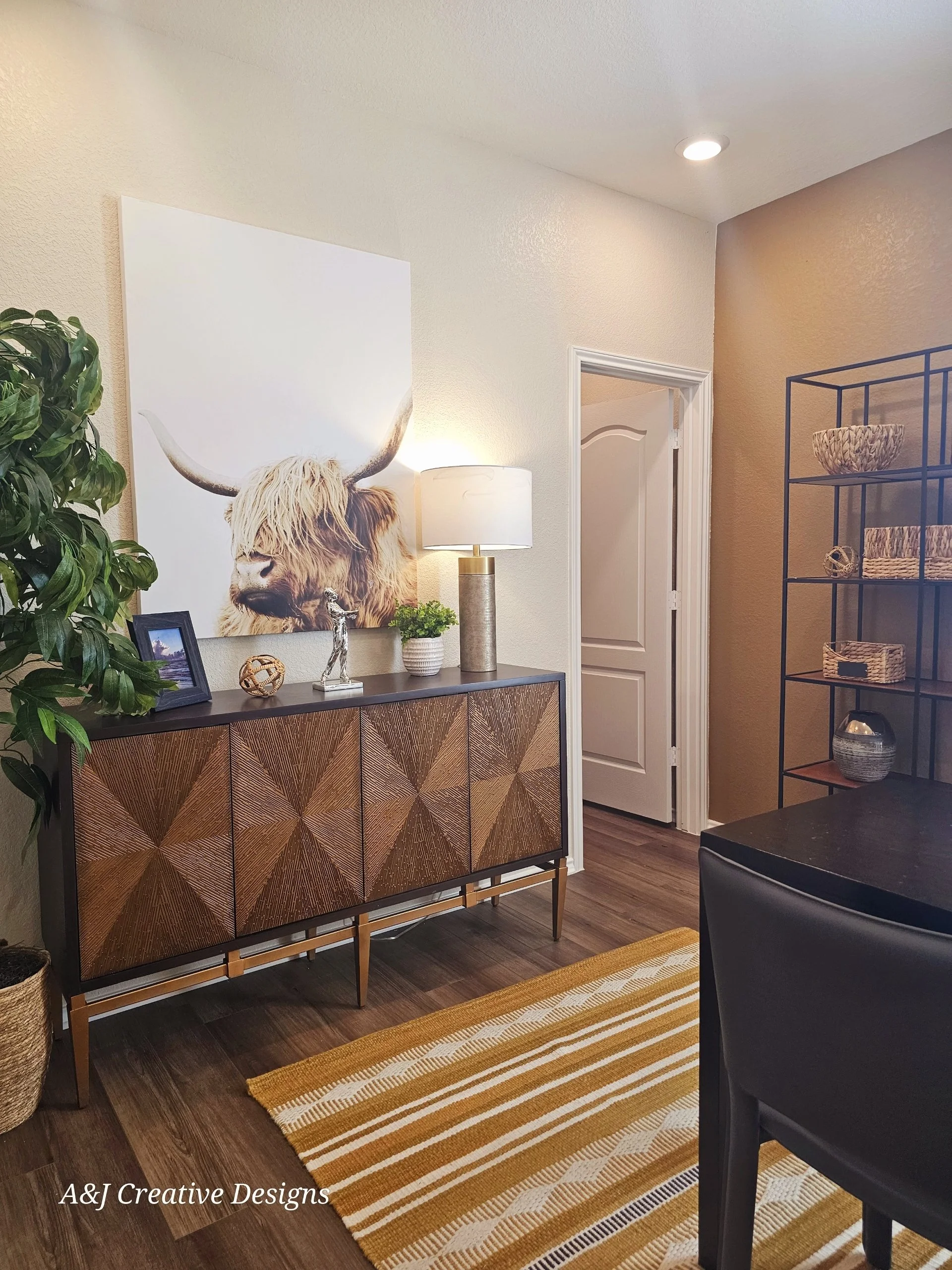 A modern interior room with a wooden sideboard, a tall lamp, a large cow painting, a black metal shelf with baskets, and a striped rug on wood flooring.