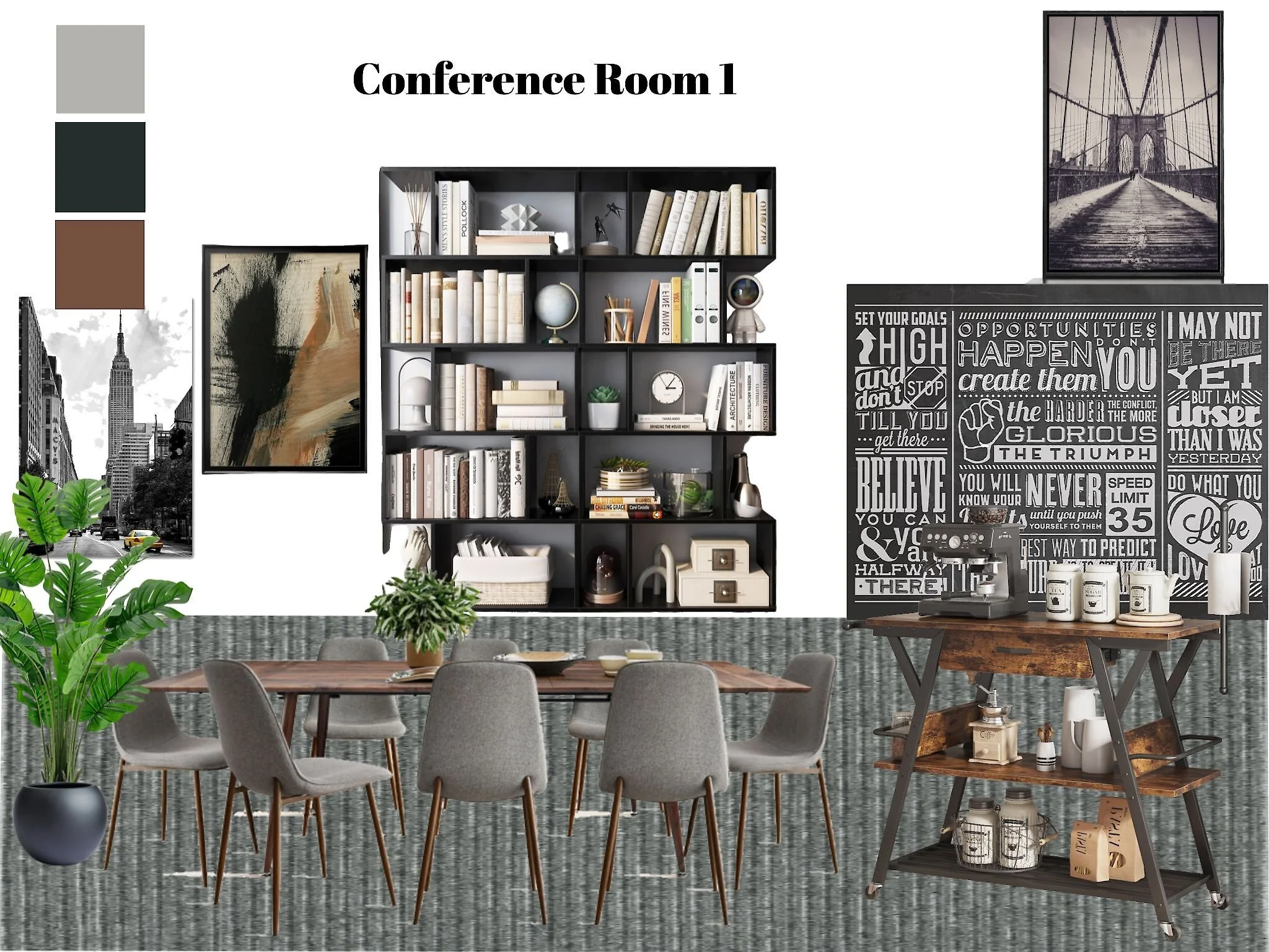 A modern conference room with a wooden table surrounded by nine gray upholstered chairs, a large black bookshelf with decorative items, a black and white wall mural of quotes, framed artwork, and cityscape and bridge photographs, a potted plant, and