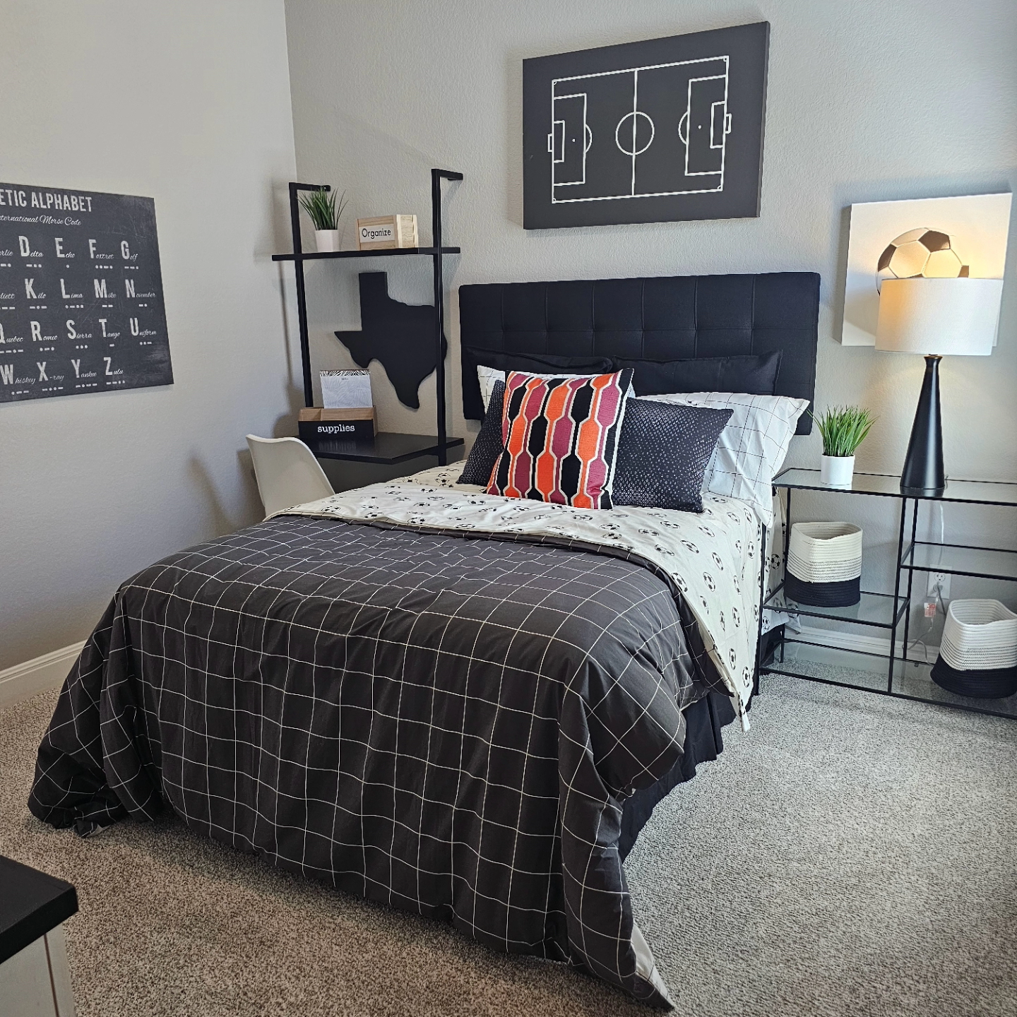 A neatly made bed with black headboard, patterned pillows, and black, white, and red bedding in a modern bedroom. Artwork of a soccer field, Texas silhouette, and a soccer ball decorates the walls. Nightstand with a lamp, small plant, and storage bas