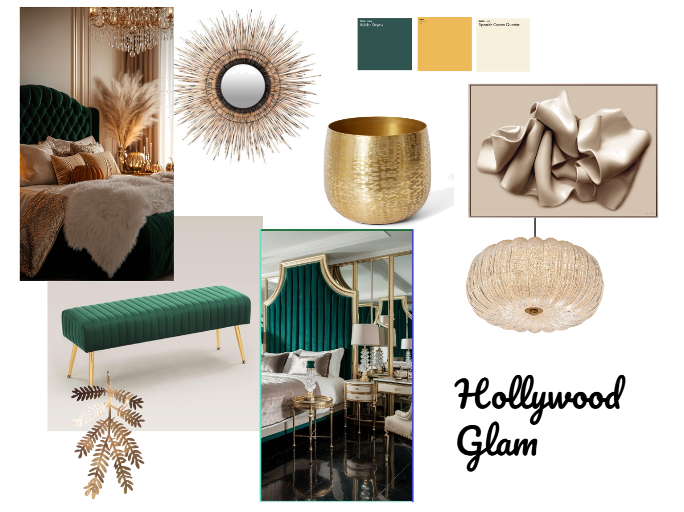 A collage of interior design elements and decor with a Hollywood glam theme, including a luxurious green velvet bedroom, gold accents, a gold textured vase, a gold starburst mirror, a beige pendant light, a crumpled beige fabric art piece, a green ve