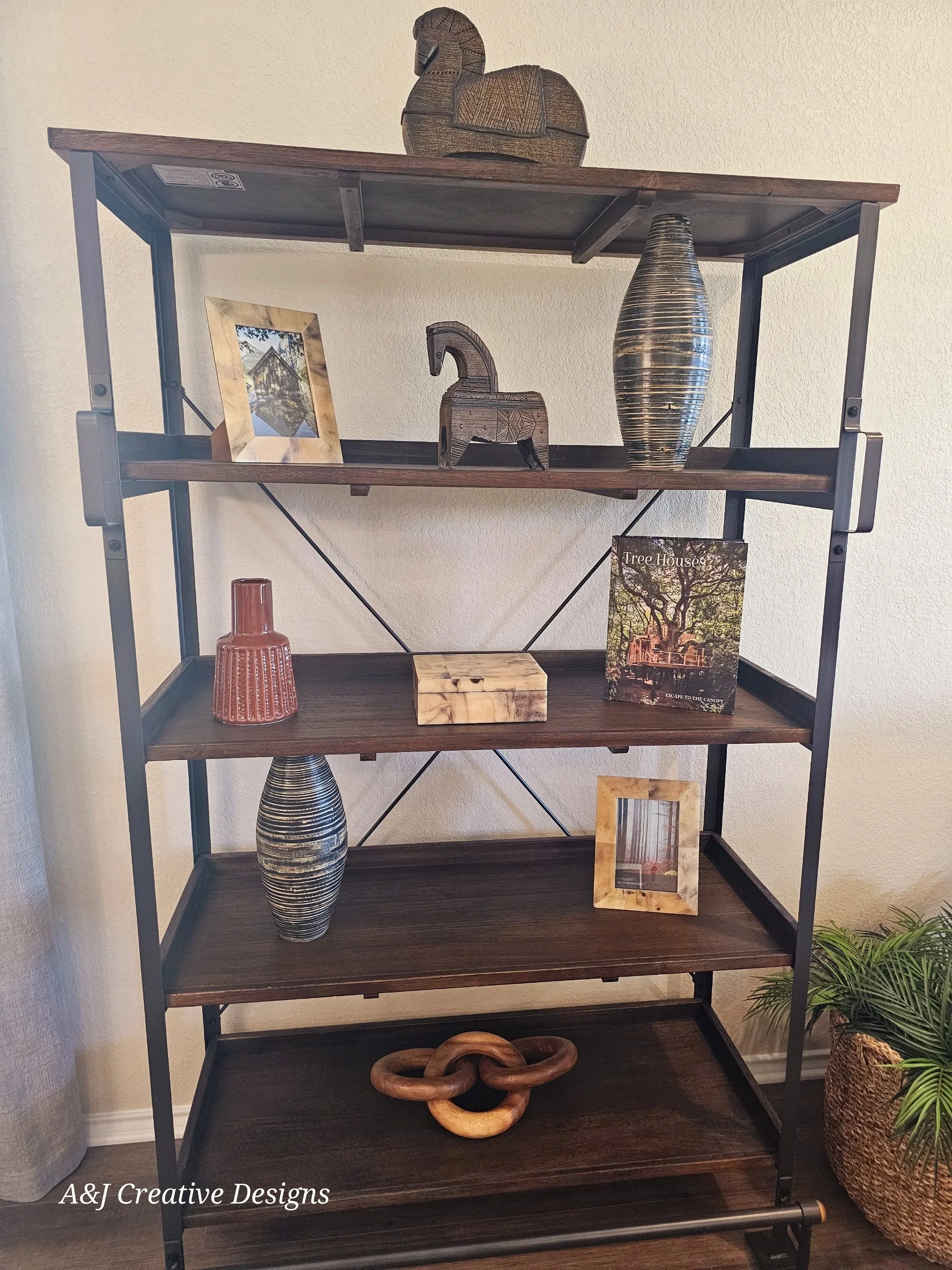 A black metal and wood tiered bookshelf with decorative items including carved wooden horse figurines, vases, photo frames, a book titled 'Tree Houses', and a wooden knot sculpture. There is also a potted plant with green leaves in a woven basket.