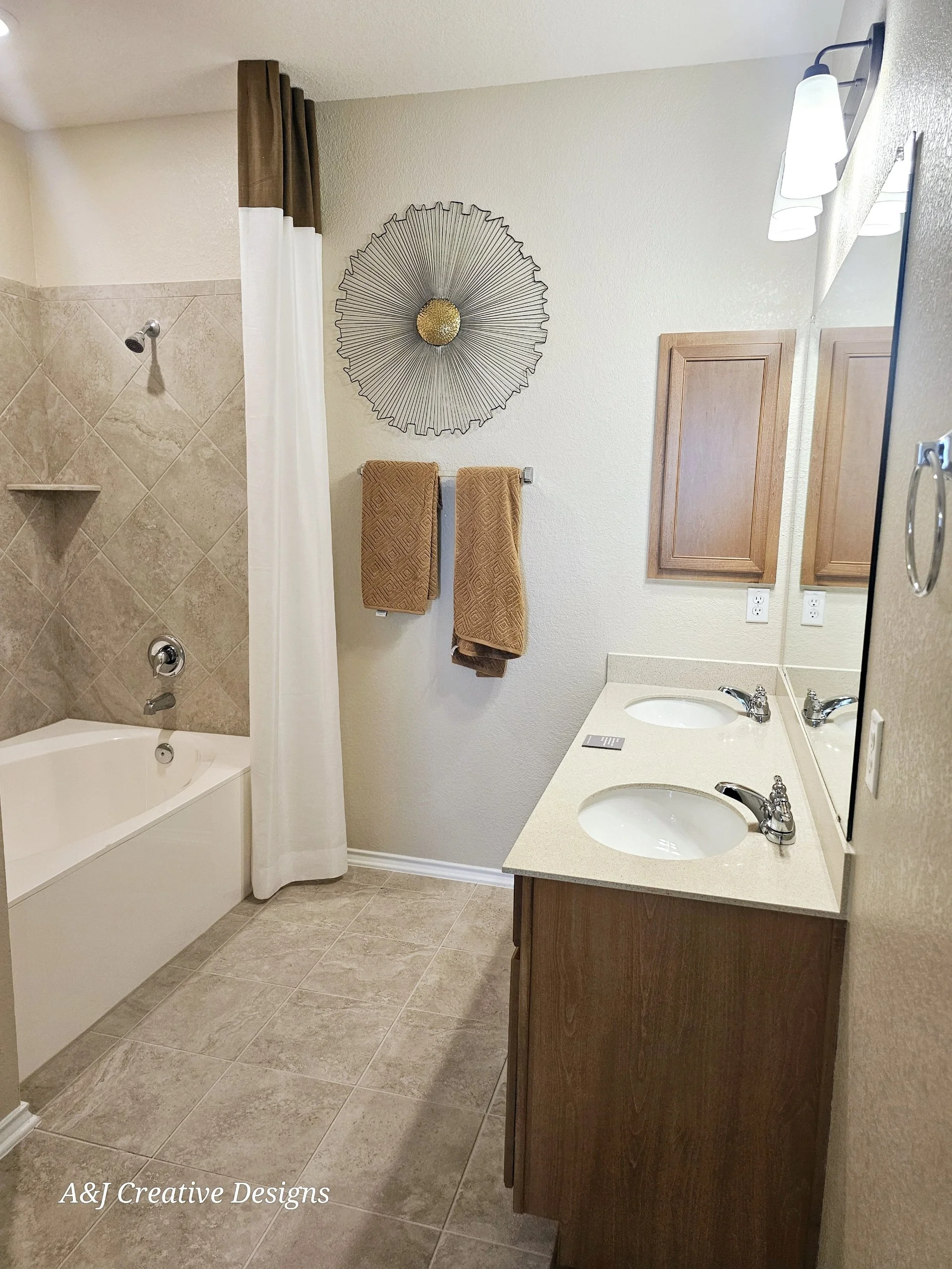 Bathroom with dual sinks, wooden cabinets, a mirror, a shower with a white curtain, and beige tiled floor and walls.