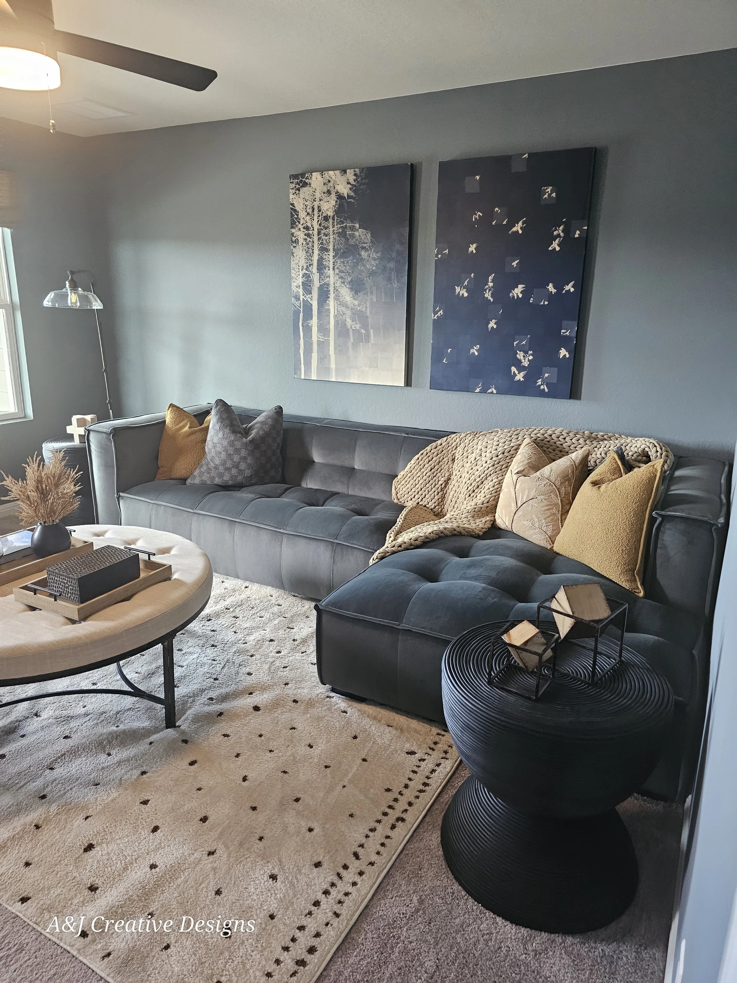Living room with a sofa decorated with mustard and gray pillows, a round coffee table, a black textured side table with small wooden decor pieces, a beige and white rug, a window with sheer curtains, and two blue art prints hanging on the blue wall.