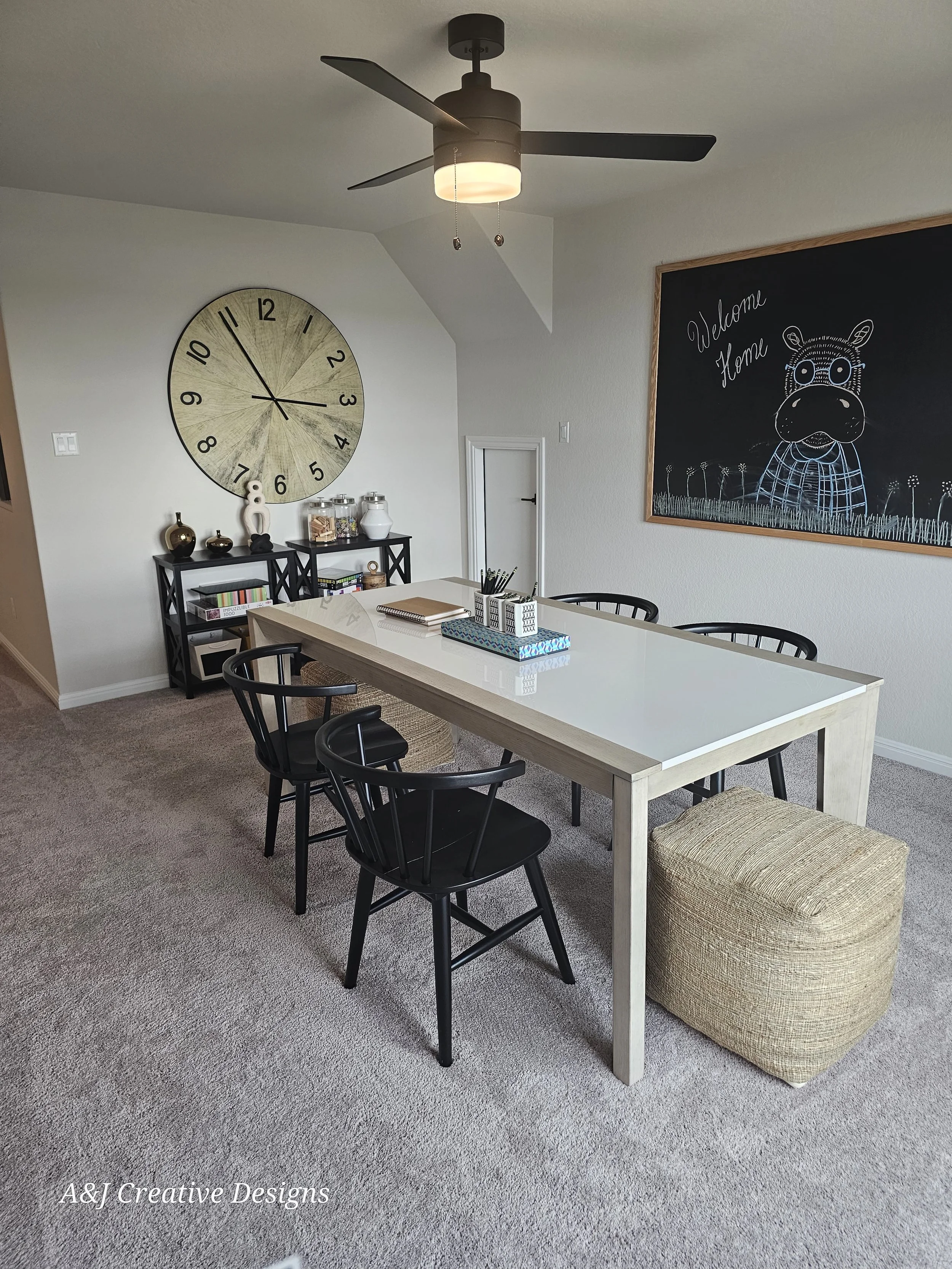 Dining room with a white table, four black chairs, a beige cushioned ottoman, a black chalkboard wall with a drawing of a hippo and the message 'Welcome Home,' a black shelf with decorative items, a large wall clock, and a ceiling fan.