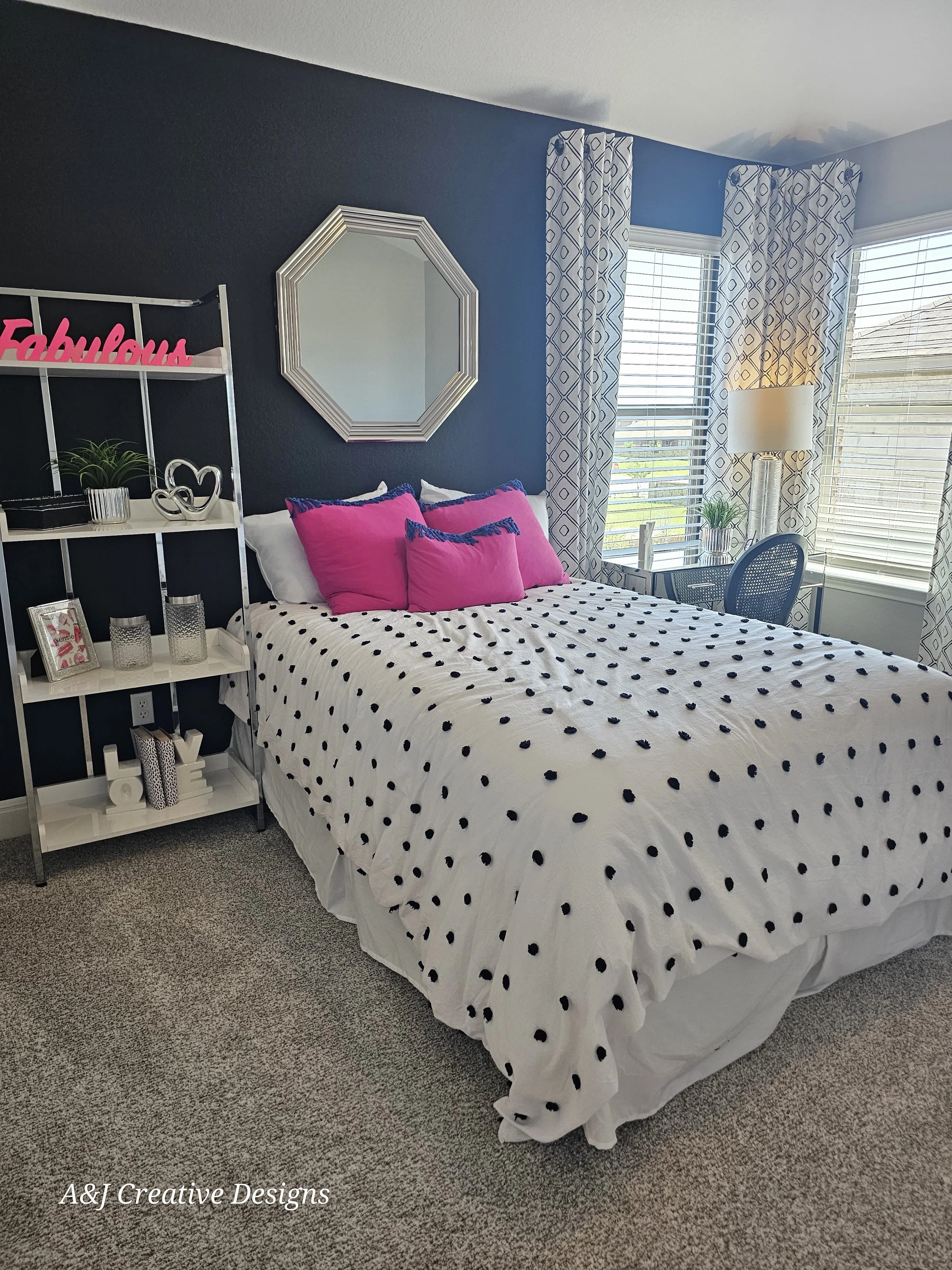 Bedroom with black accent wall, octagonal mirror, polka dot bedding, pink pillows, and decorative shelving. Curtains with geometric pattern.