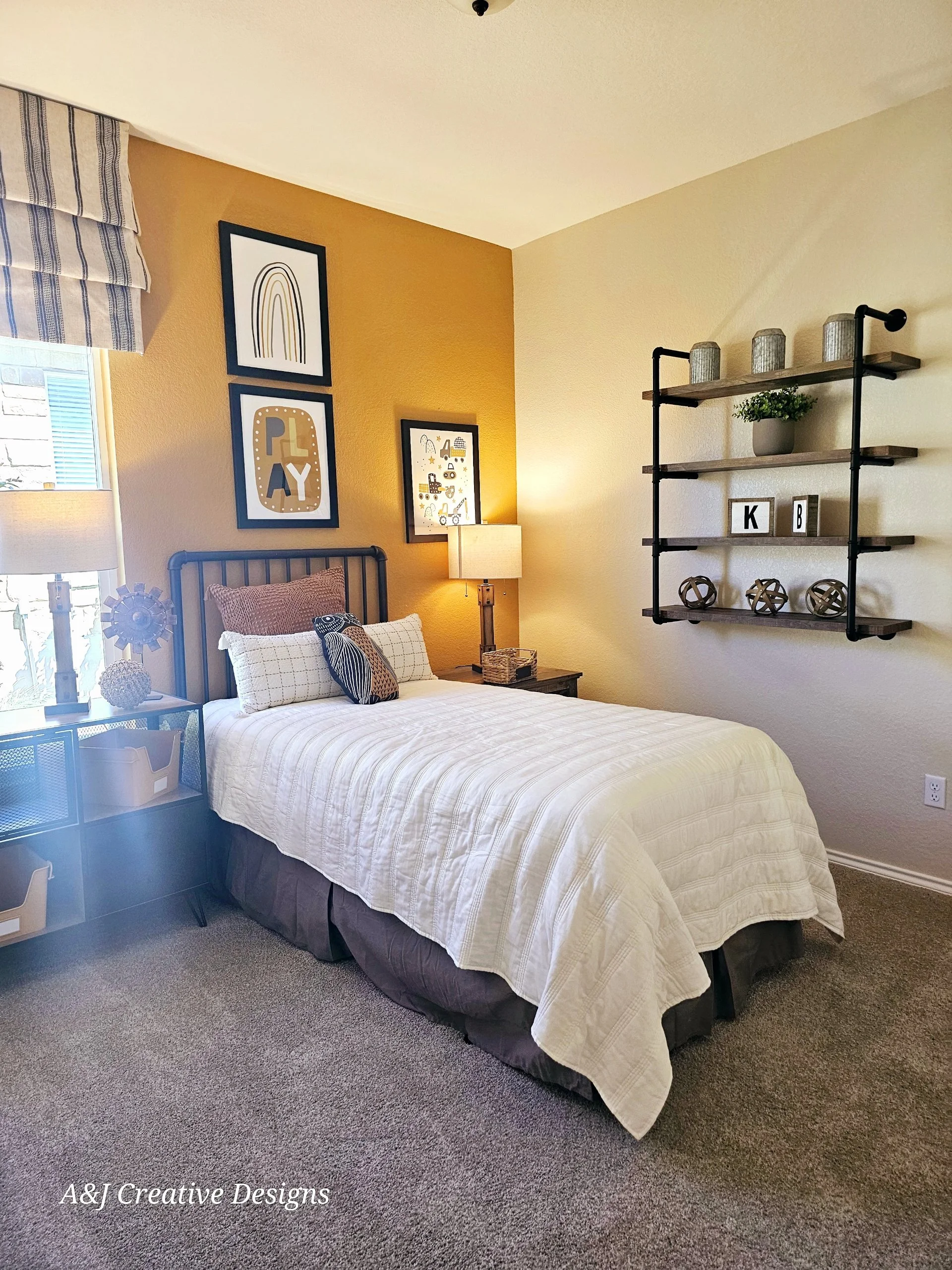 A cozy bedroom featuring a bed with white bedding, a dark metal headboard, and decorative pillows. To the left, a nightstand with a lamp, a globe, and storage baskets. The wall behind the bed is painted yellow and adorned with three framed art prints