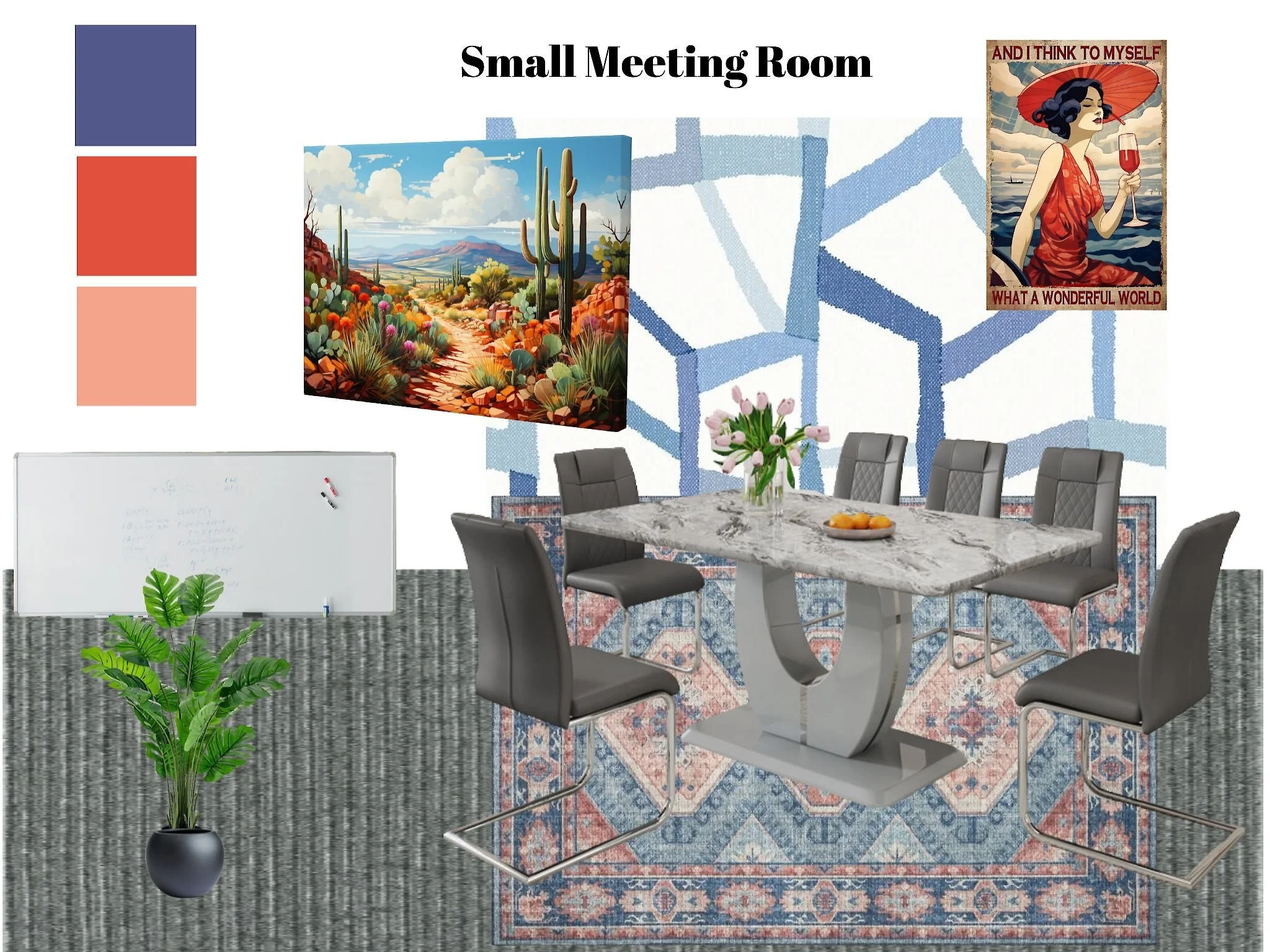 A small meeting room with a marble table surrounded by six black chairs, a whiteboard, a plant, a colorful rug, and wall art including a desert landscape and a vintage poster. The wall has a geometric blue pattern.