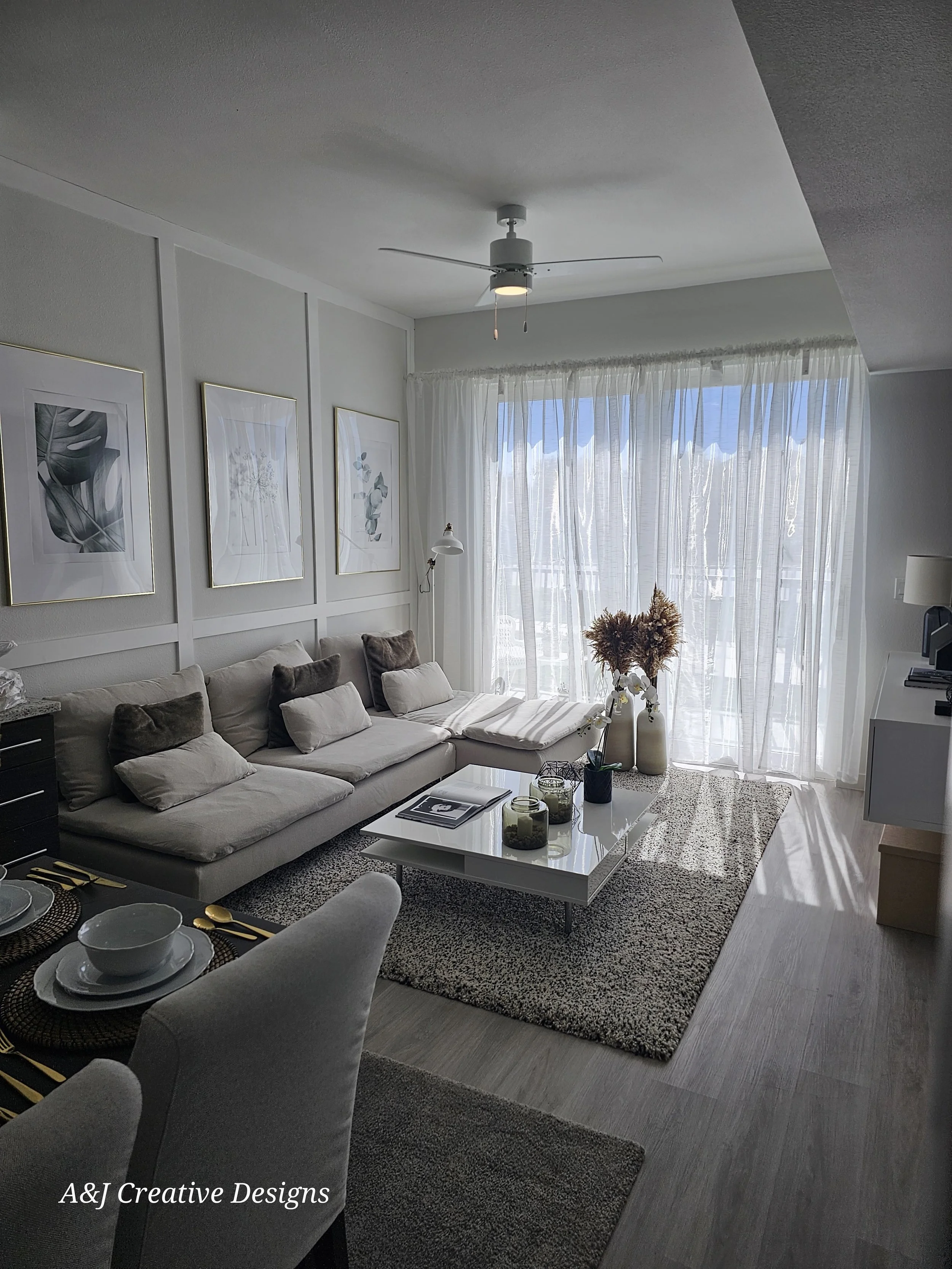 Living room with a beige sectional sofa, modern white coffee table with candles and books, dark gray rug, large window with sheer white curtains, side table with lamp, wall art, and dining area with plates and cutlery.