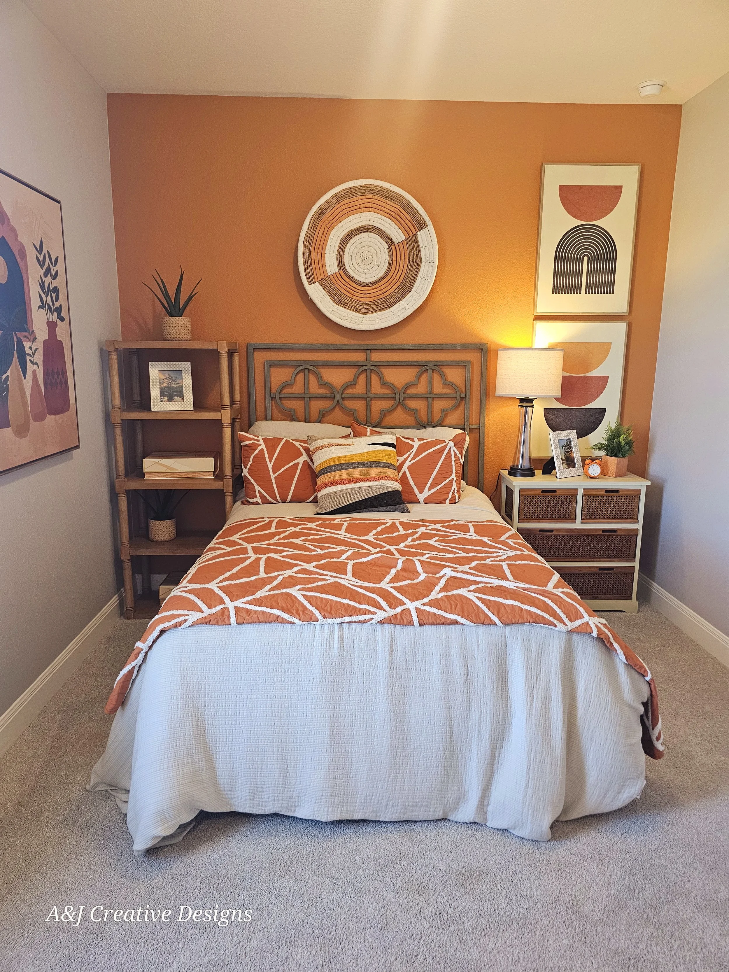 Bedroom with a bed covered in an orange and white patterned bedspread and pillows, a wooden headboard, a side table with a lamp, framed artwork on the wall, and decorative plants.