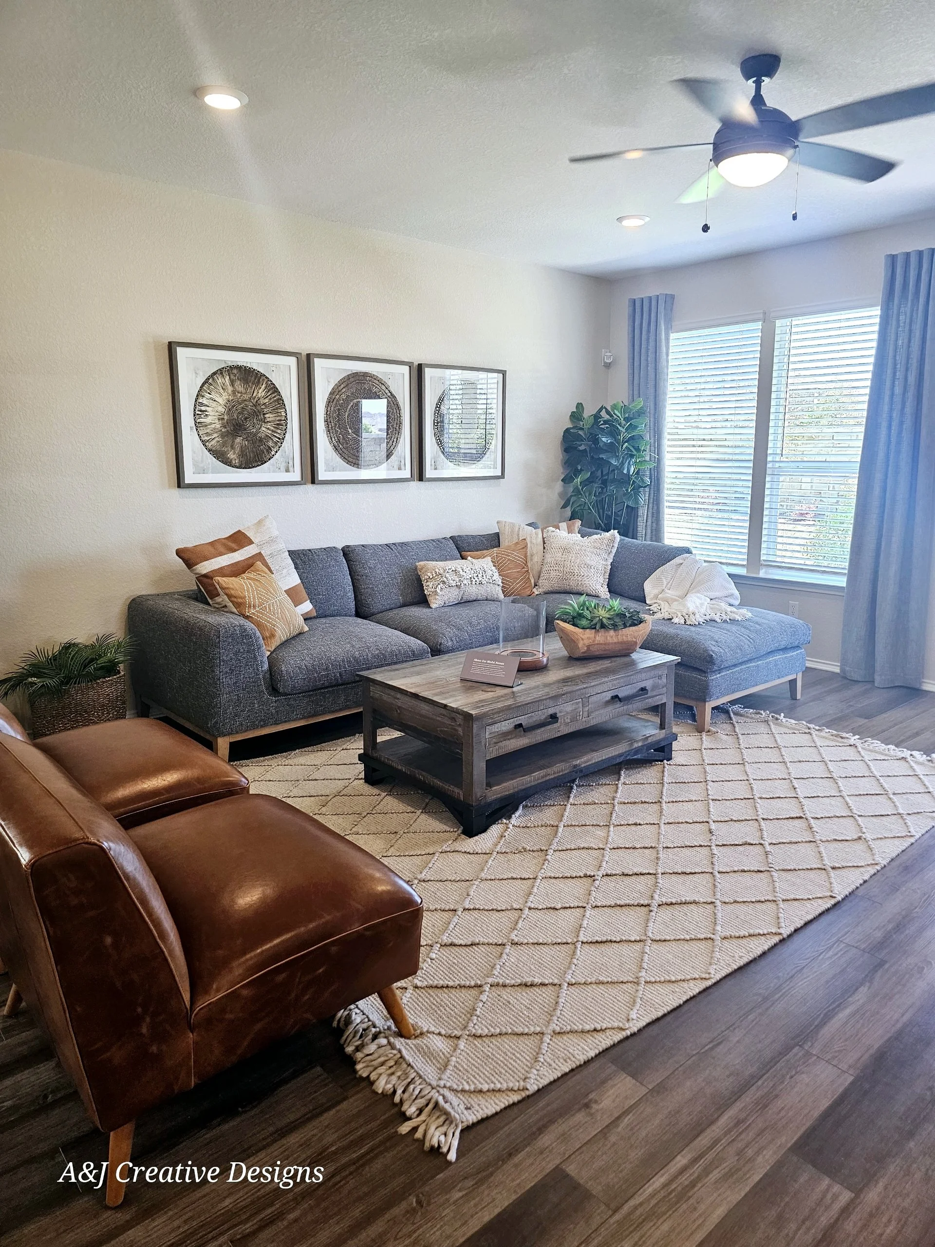 Living room with a dark grey sectional sofa, a brown leather armchair, a wooden coffee table, a patterned beige rug, framed wall art, a large window with blinds and blue curtains, a ceiling fan, potted plants, and decorative pillows.