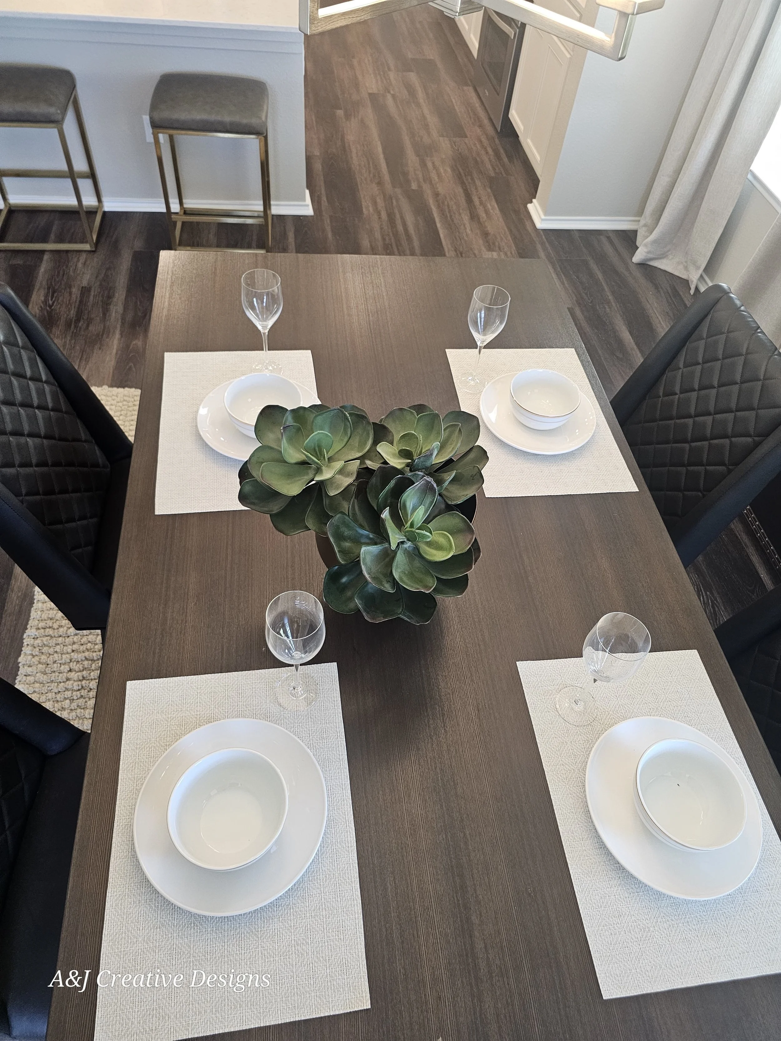 Dining table set for four with white dishes, wine glasses, and a green succulent centerpiece in a modern kitchen.