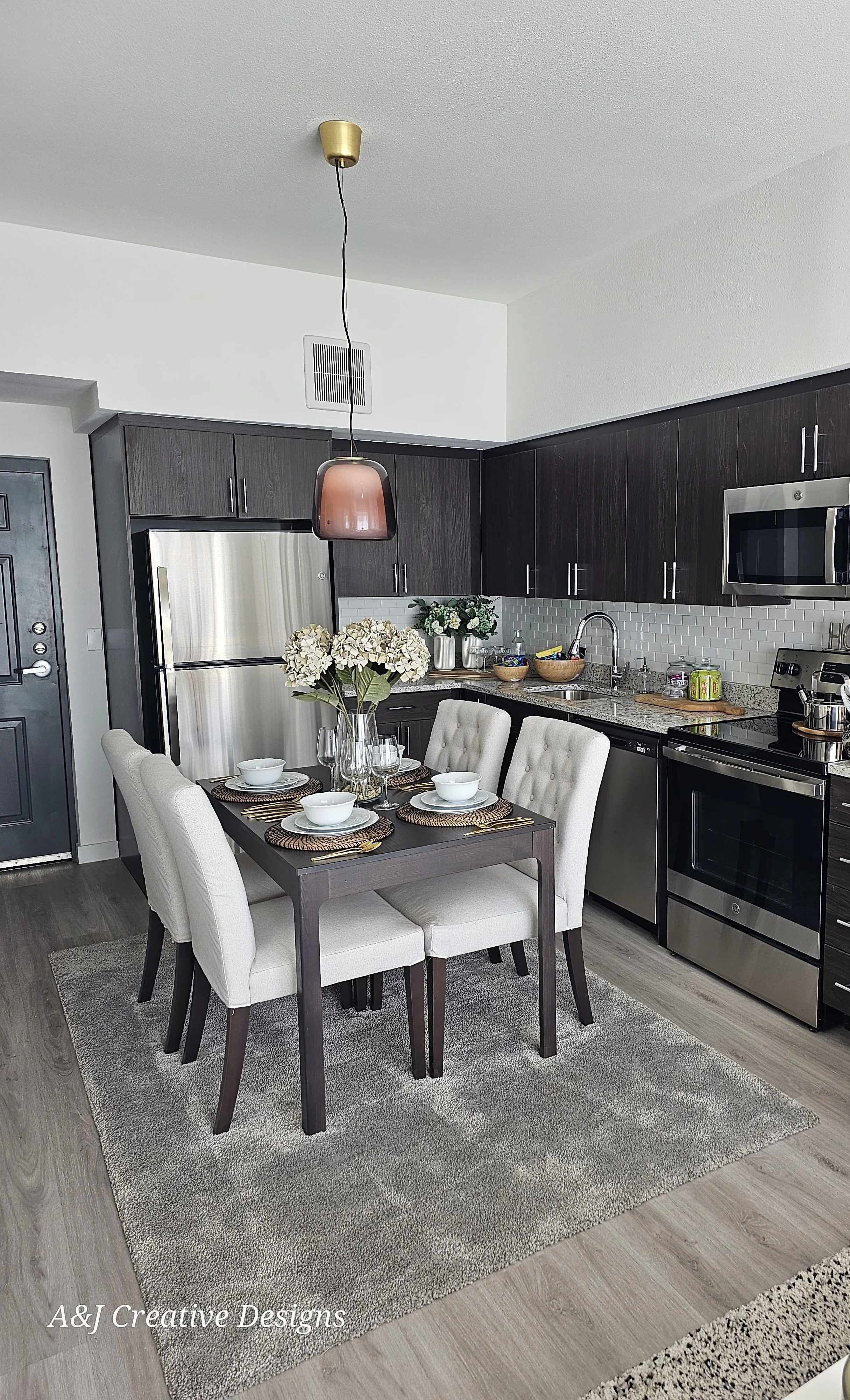 Modern kitchen with dark wood cabinets, stainless steel appliances including refrigerator, oven, microwave, and dishwasher. Dining table set for four with white upholstered chairs and a floral centerpiece. Light-colored flooring, white tiled backspla