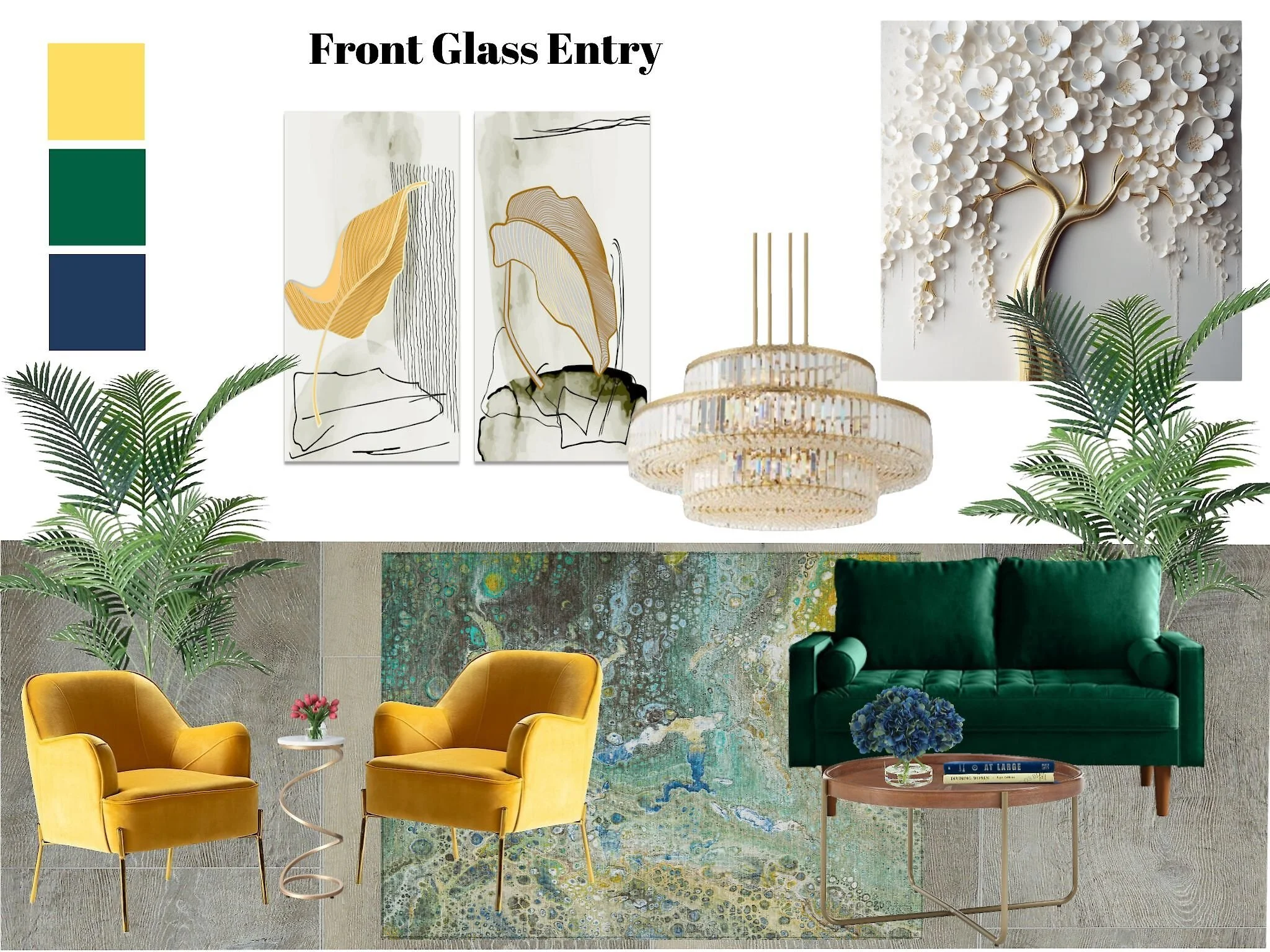 Interior living space with a modern decor theme featuring a green velvet sofa, two yellow armchairs, a round wooden coffee table with a blue flower arrangement, two large potted palm plants, a white textured wall with abstract and nature-inspired art