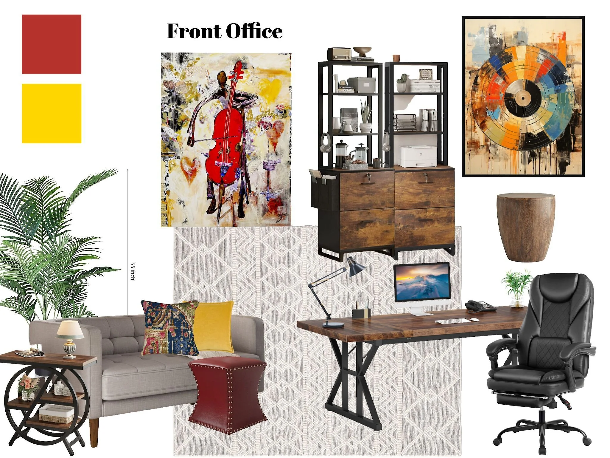 A modern home office decorated with framed abstract art, a black office chair, wooden desk, potted plants, a cream sofa with colorful pillows, two wooden cabinets, a white patterned rug, and various decorative items.