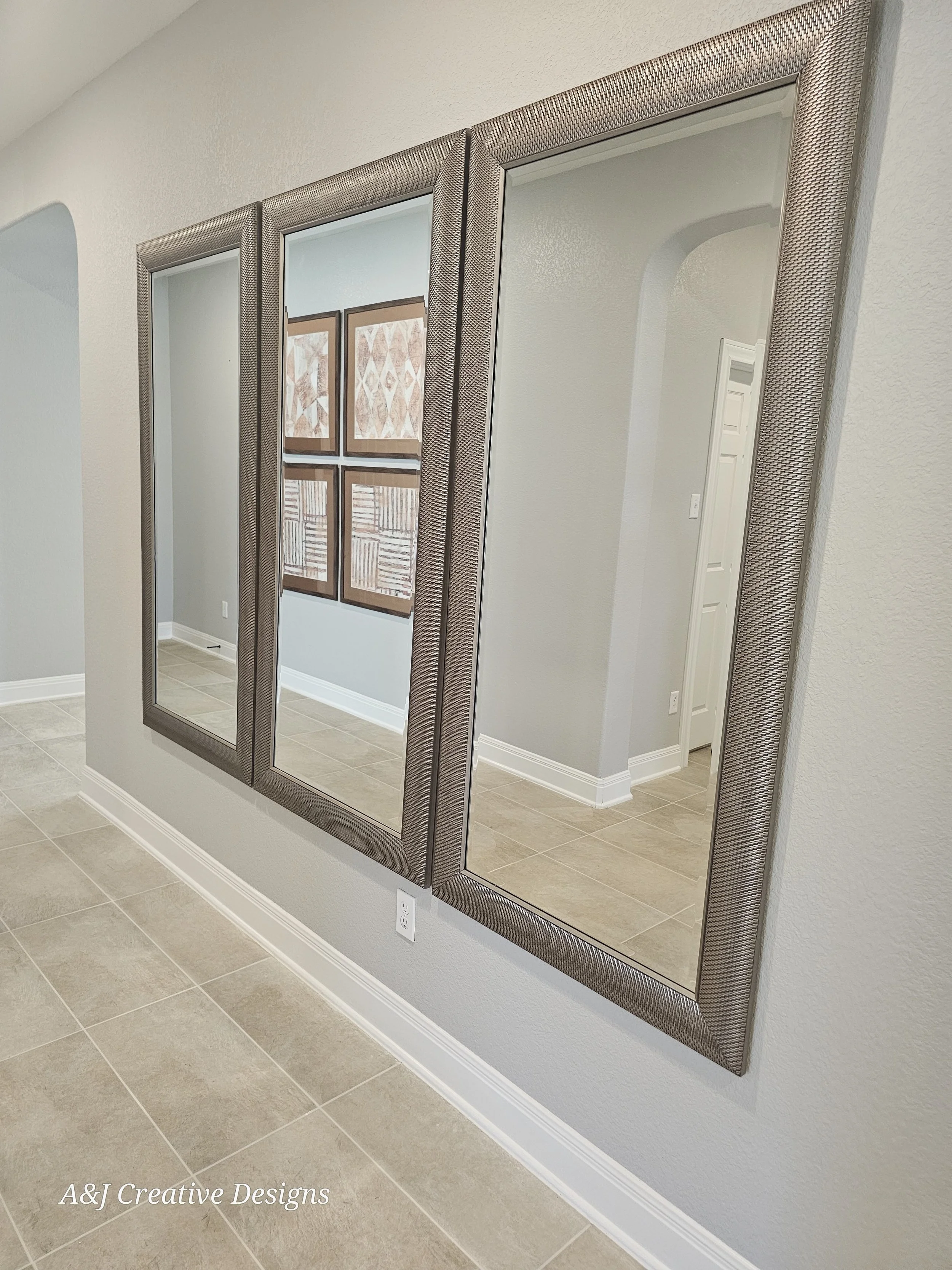 Three large rectangular mirrors with metallic frames hanging on a light gray wall in a room with beige tiled flooring.