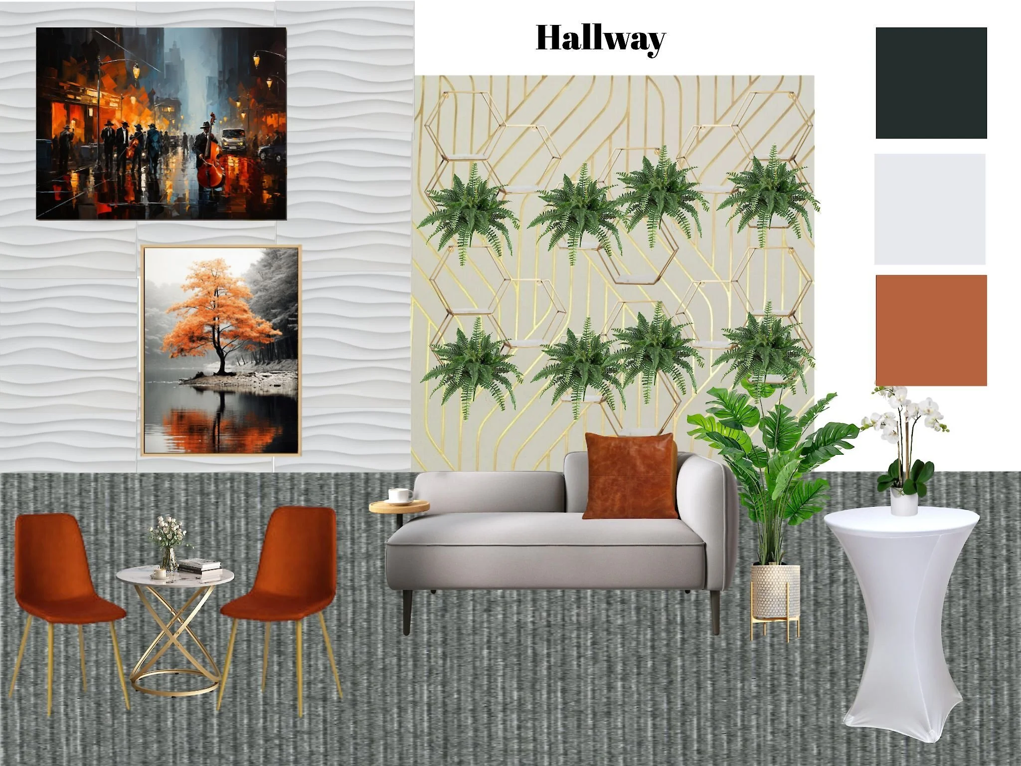 Interior of a modern lounge area with a gray sofa and a brown pillow, a small round table with a cup, orange chairs with gold legs and a small vase, framed artwork of a city street scene at night, a black and white photograph of a tree by the water,