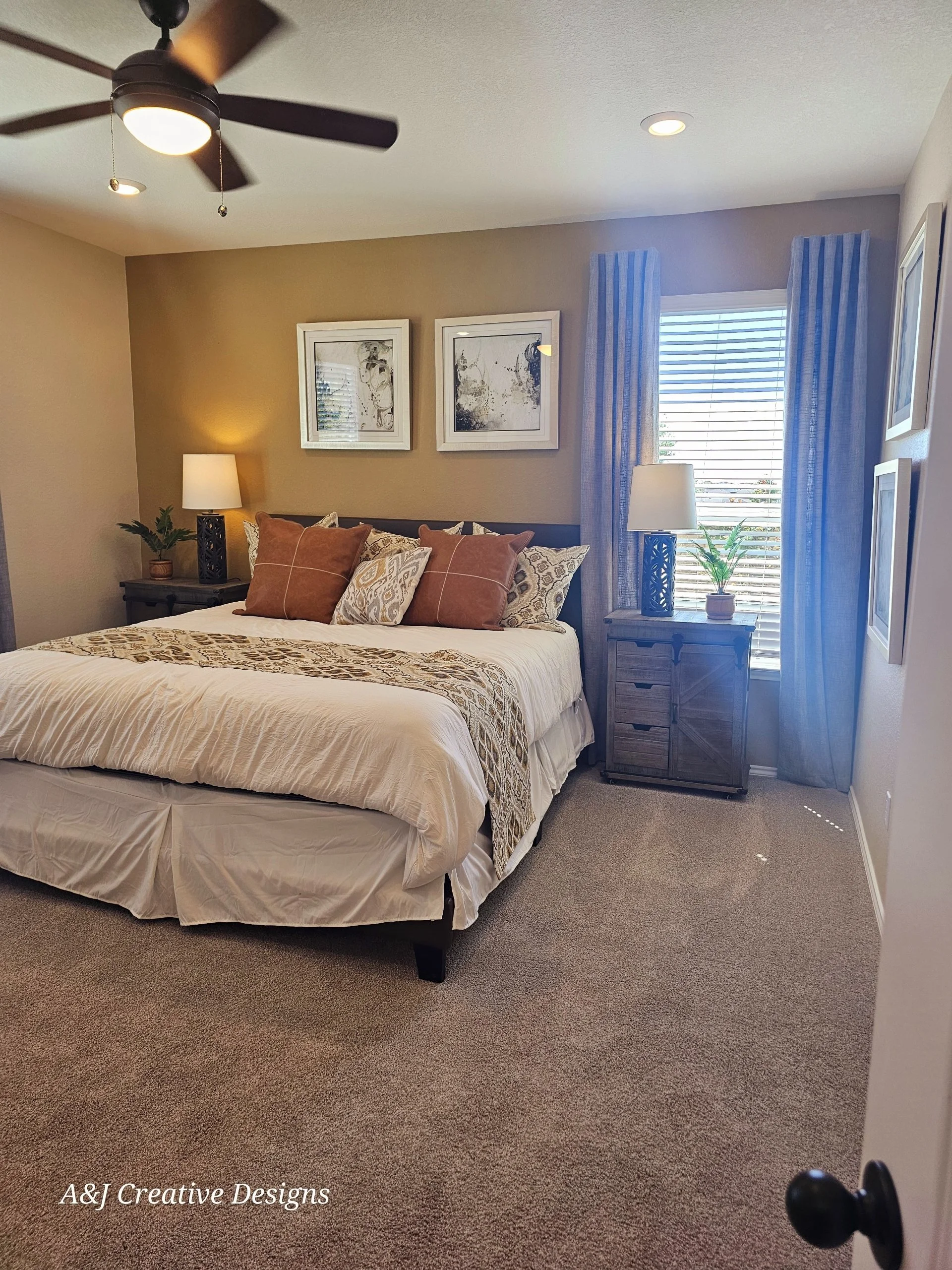 A bedroom with a queen-sized bed with multiple pillows, two nightstands with lamps, a ceiling fan, and large windows with curtains showing an outdoor view.