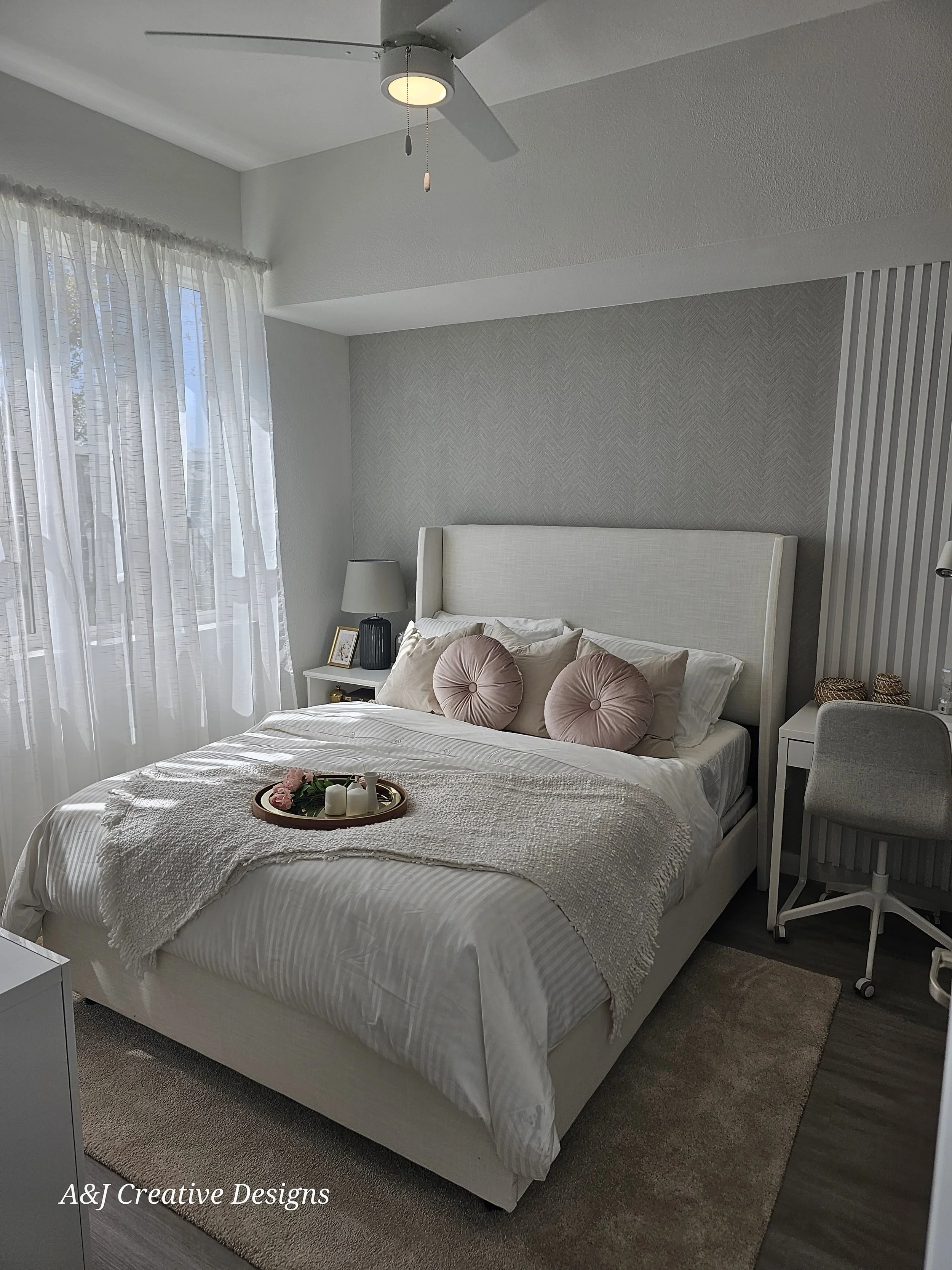 Modern bedroom featuring a white bed with textured headboard, two pink round cushions, white throw blanket, and tray with candles. A grey desk chair and lamp are nearby, with sheer curtains and a ceiling fan above.