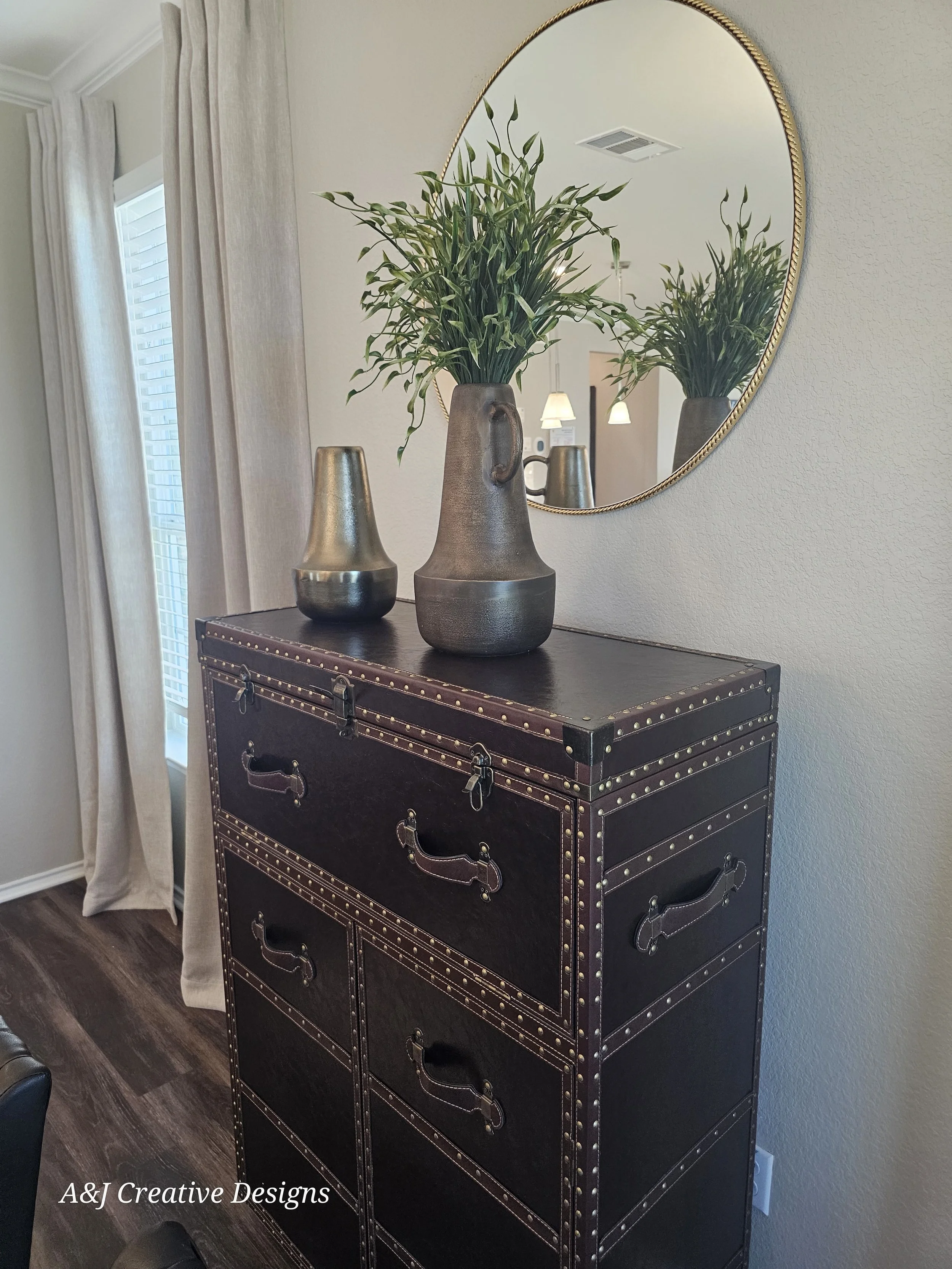 A black vintage-style dresser with brass stud accents, topped with a metallic vase and a ceramic vase holding greenery, is reflected in a round wall mirror. Light-colored curtains are in the background.