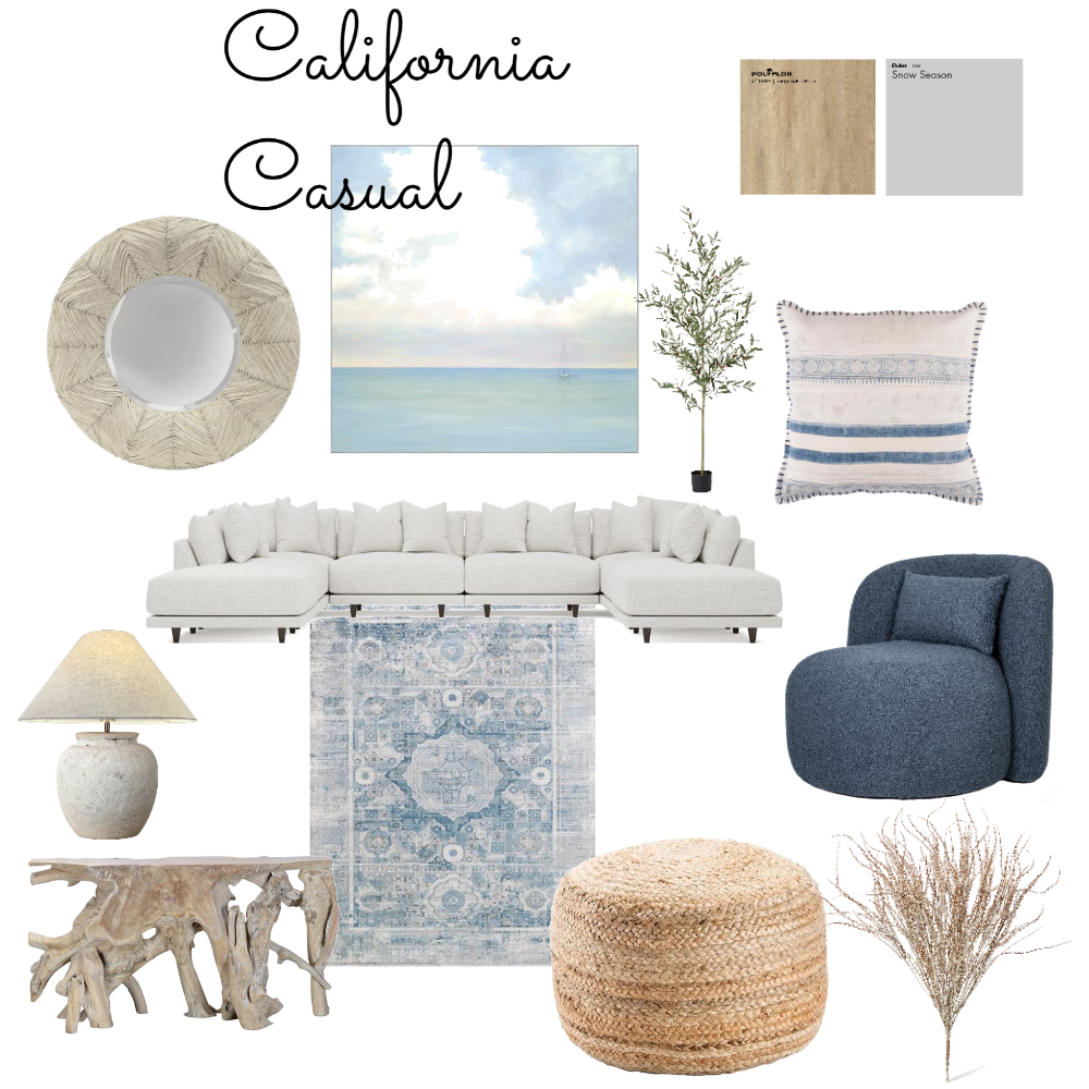 Interior design mood board titled 'California Casual' featuring a white sectional sofa, a blue accent chair, a woven ottoman, a vintage area rug, a table lamp, a large decorative mirror, a wall painting of a seascape, a small potted tree, a patterned